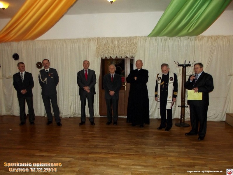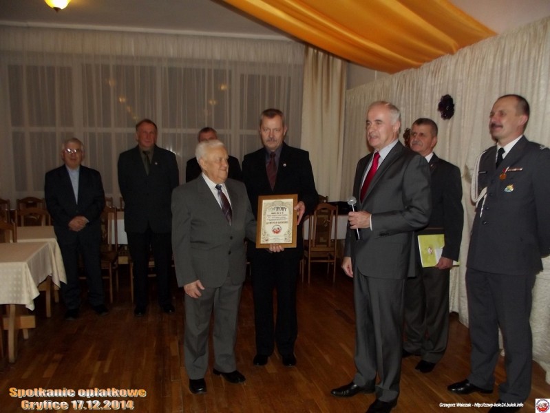 Uroczystość Wigilijną rozpoczął prezes Zarządu Koła ZŻ WP płk rez. Krzysztof Tokarczyk, który jako gospodarz spotkania, serdecznie powitał zaproszonych gości i licznie przybyłych członków Koła oraz złożył im najmilsze świąteczno-noworoczne życzenia. W krótkich słowach omówił również osiągnięcia członków Koła w działalności organizacyjnej, socjalno zdrowotnej i w zawodach strzelecko-obronnych. Następnie, minutą ciszy uczczono pamięć zmarłego w bieżącym roku śp. ppłk Marka Walenczaka, byłego sekretarza Zarządu Koła. Po czym nastąpiła miła uroczystość wręczenia Aktu Nadania tytułu Honorowego Członka Koła nr 24 ZŻ WP im. l Armii Wojska Polskiego w Gryficach, na podstawie podjętej Uchwały nr 2/XI/14 z dnia 19.11.2014r. walnego zebrania Koła nr 24 ZŻ WP, dla ppłk rez. Mieczysława Marcinkowskiego. Okolicznościowy akt nadania wręczył wyróżnionemu Prezes Zarządu Koła płk rez. Krzysztof Tokarczyk.