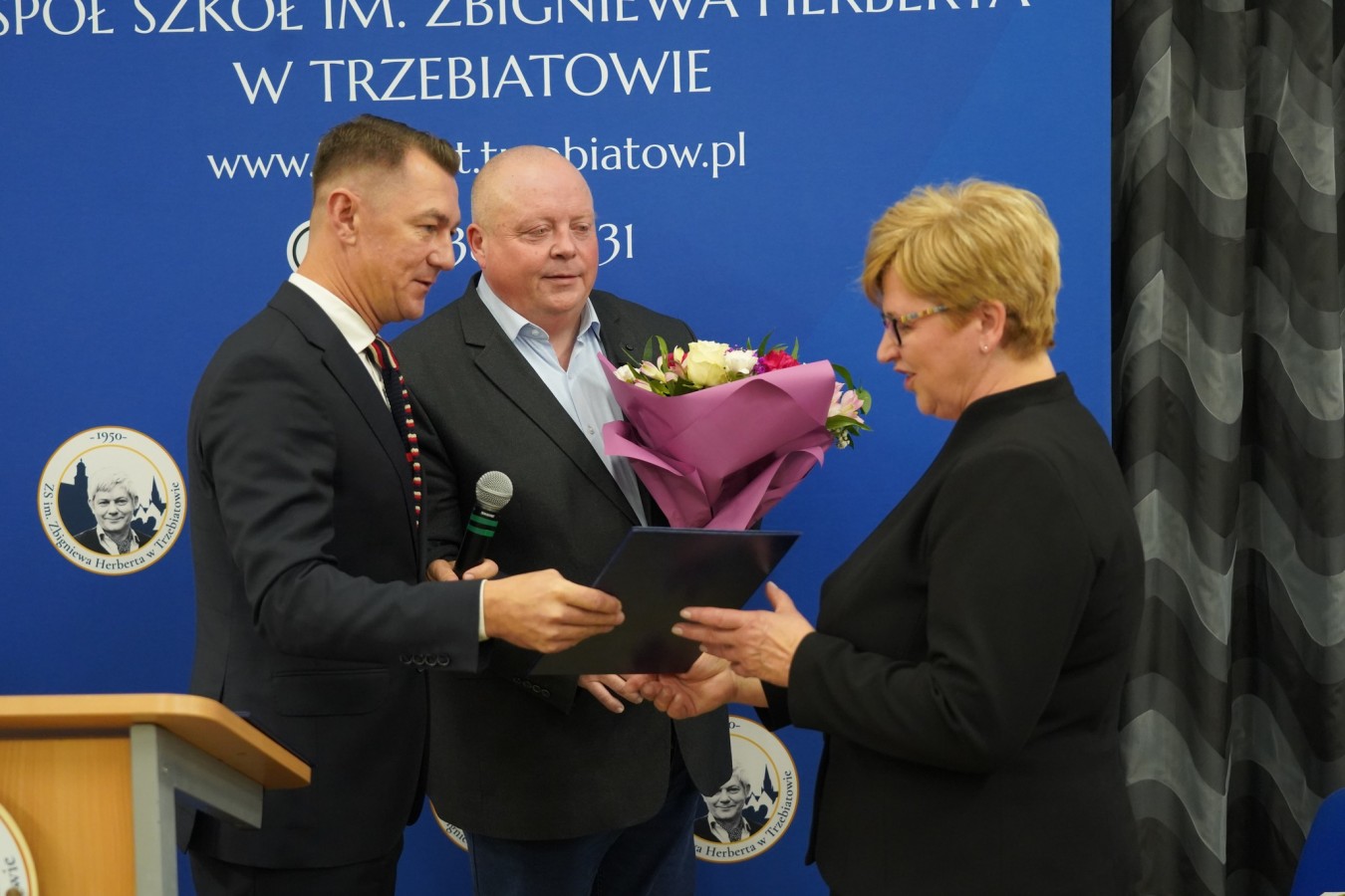 W uroczystości uczestniczyli Przewodniczący Rady Powiatu Gryfickiego Łukasz Czyrny oraz Członek Zarządu Powiatu Gryfickiego Adrian Żoła, którzy w imieniu Starosty Powiatu Gryfickiego wręczyli Pani Dyrektor Jadwidze Jaworskiej oraz nauczycielowi Marioli Niewiadomskiej Nagrody Starosty Gryfickiego z okazji Dnia Edukacji Narodowej.