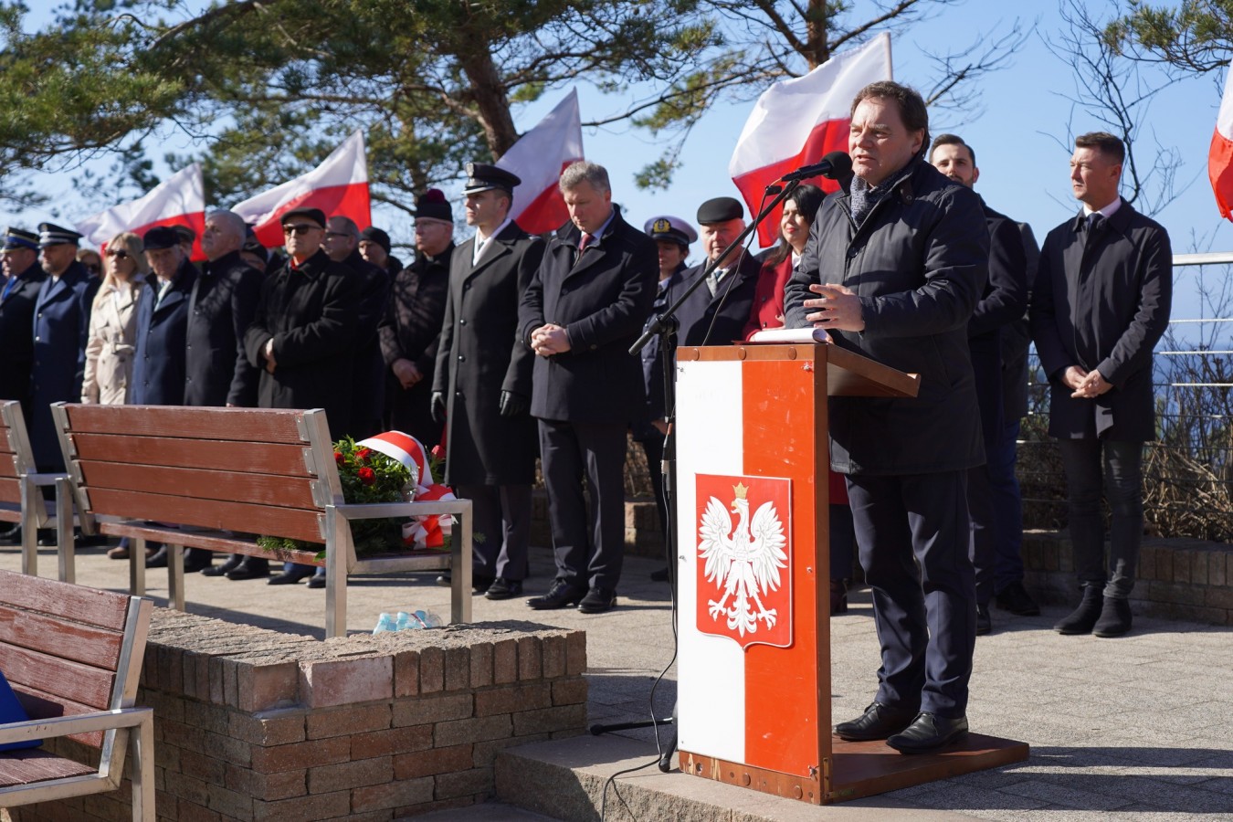 Druga część obchodów odbyła się przed Pomnikiem Zaślubin. Przybliżono tam historię wydarzeń, które rozegrały się na mrzeżyńskiej plaży. W symboliczny sposób oddano hołd poprzez zanurzenie biało-czerwonej flagi w wodach Bałtyku oraz wrzucenie pierścienia do morza, a także złożono kwiaty i zapalono znicze pod Pomnikiem Zaślubin.